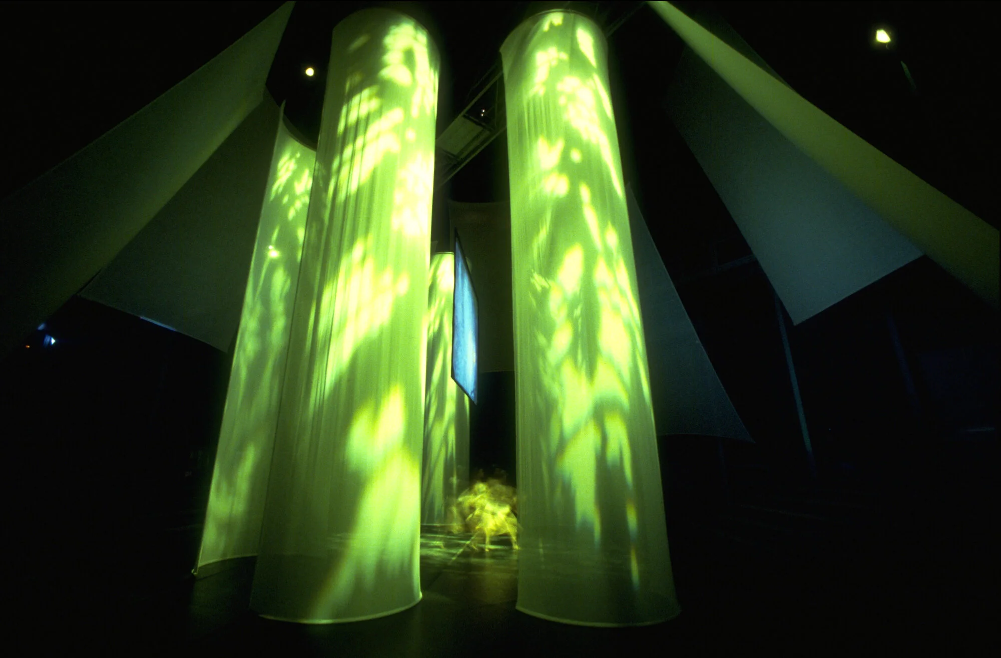 Performance version by Ellen Sebring (video and music) and Beth Galston (sculptural environment), with Sarah Skaggs (dance), MIT Media Lab Cube. Photos: Beth Galston