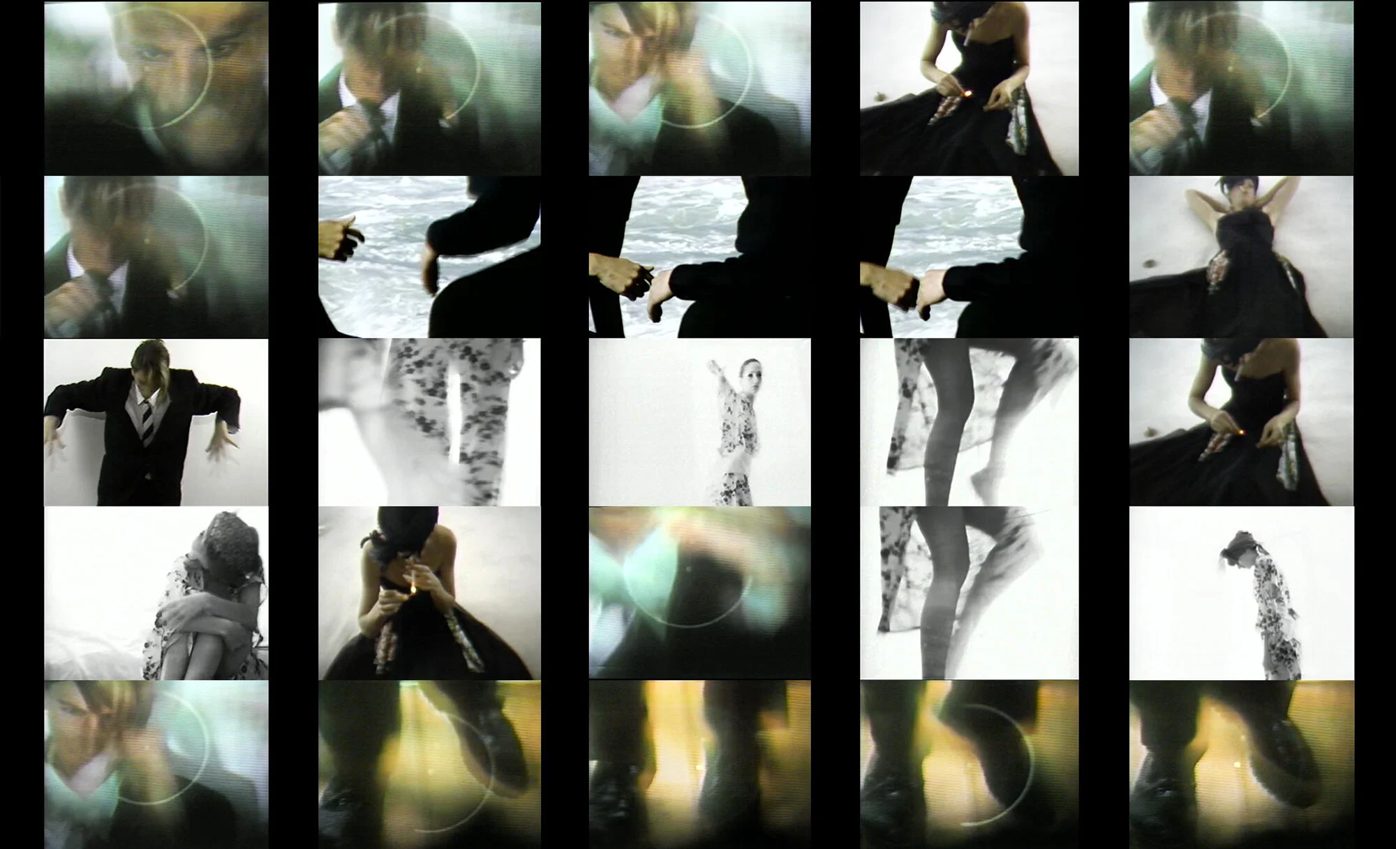 “The Boxer's Puzzle suggests an oblique narrative of desire, combining the visual stylization of a music video with a subtle allusiveness and meticulous attention to detail. Using slow motion images and a hypnotic, percussive soundtrack, the artists create a languid, erotic work. A man shadowboxes, his sparring suggesting inner conflict, while a woman is seen in a series of fashion-photo poses, remaining an enigmatic figure, an icon of elusive desire. Seen in isolation, and juxtaposed through syncopated cross-cutting, the man and woman seem caught in the grip of an unreleasable tension, made palpable by the artists' deft editing.”