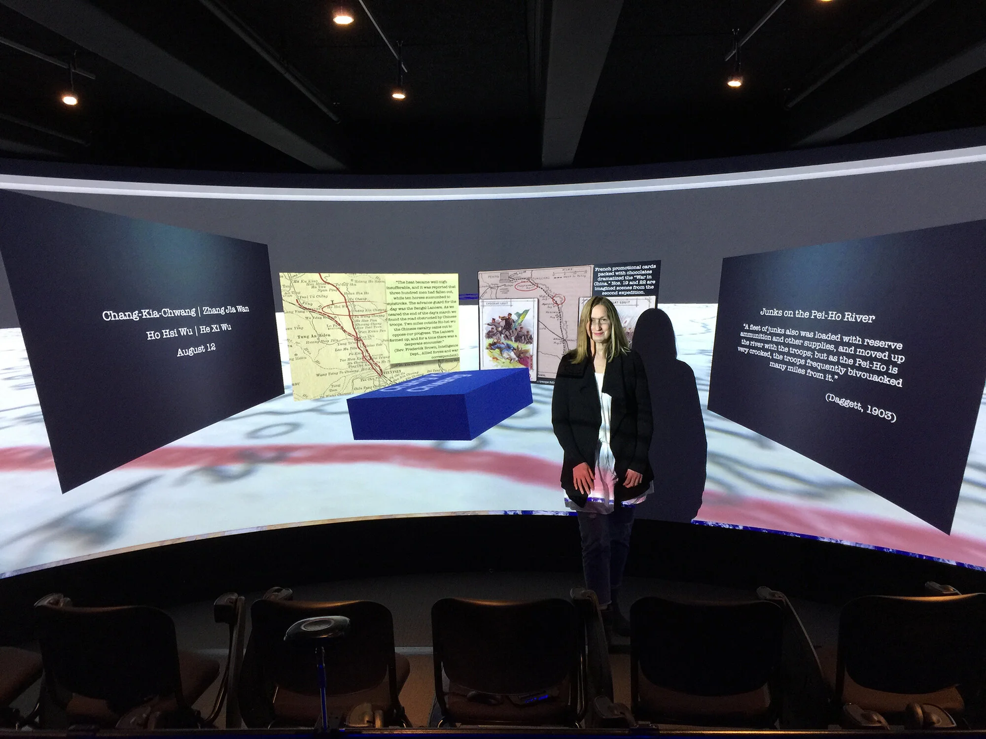 Sebring designed the VR project, March 1900, as an experiment in immersive historical narrative. It was coded for Oculus Rift by her students at Duke University, and further developed at the Harvard Visualization Lab. The VR prototype uses period maps and images to visualize the ten-day march on Beijing in August 1900 by invading armies—an expeditionary force mounted by eight foreign powers to relieve a protracted siege of the diplomatic quarter by Boxer rebels and Chinese troops. The complexity of the Boxer Uprising would emerge in a larger digital build that would incorporate multiple intersecting thematic pathways. The project reimagines a digital archive as a spatial experience that uses VR to evoke some of the tactile qualities of physical archives. The image “pathway” juxtaposes diverse sources: animated maps; photographs taken along the army’s route that capture the physical conditions and moment-by-moment unfolding of events; and illustrated news that offer an interpretive viewpoint from the outside world. Sebring presented a beta version of the project at the Association for Asian Studies conference in 2019.