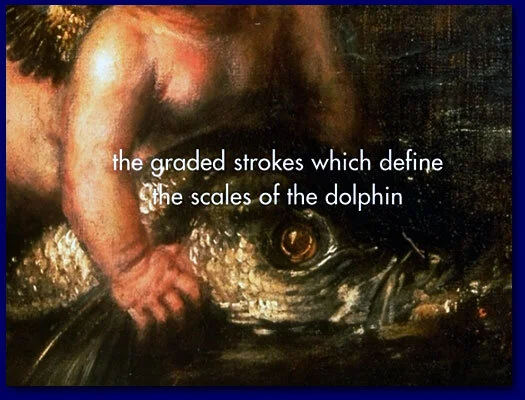 “As for the computer images, they actually are a big deal. The Gardner’s DVD (Digital Video Disk) kiosk allows you to take any element of Europa and blow it up to full-screen size without sacrificing resolution. The Gardner staff have divided the painting into 20 “nuggets” (you can get a list by touching KEY): Europa, the bull (Zeus in disguise), the fish, the putti, the mountains, etc. — each with its own lucid accompanying text. The “black hole” area toward the lower left is the “Death” nugget; it tells how Titian died, in 1576, from the Plague. Don’t miss “Echoes,” which shows how Titian unifies the painting by repeating thematic elements: the angle of legs, the swirling of drapery, the preponderance of eyes. You could easily enjoy an hour at the kiosk, but even five minutes before going in to the show will have you poised to compare what Titian and Rubens have done.”